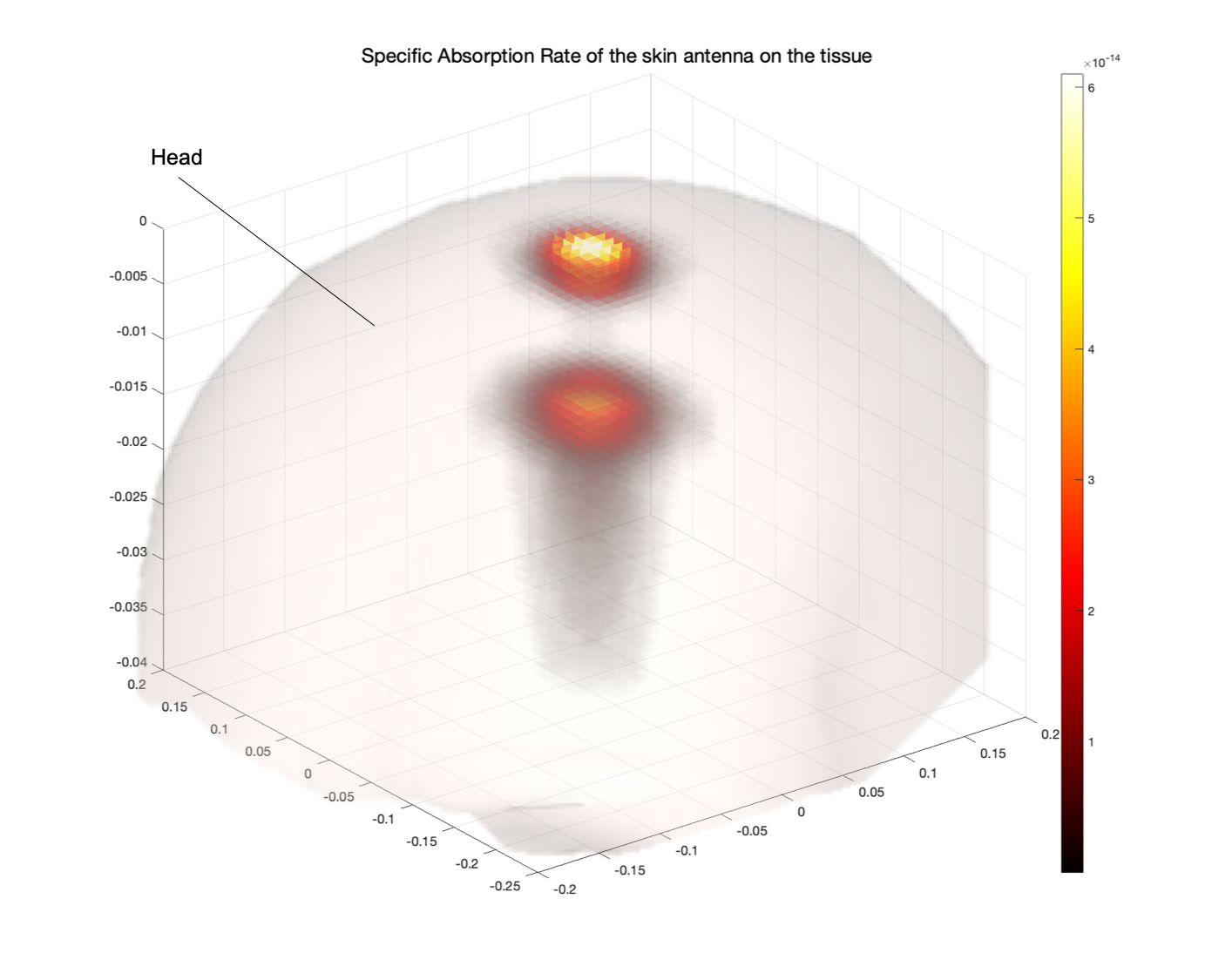To simulate the Specific Absorption Rate of the transmitter antenna I wrote a MATLAB code that given a set of 3 antenna designs realized with the Antenna Toolbox extracts the gain, power and electric field of the antenna and simulates the intensity of the electric field through the different tissue layers of the head and the absorption rate in W/Kg to make sure that the tissue heating follows FCC regulations (<1.6 W/Kg).